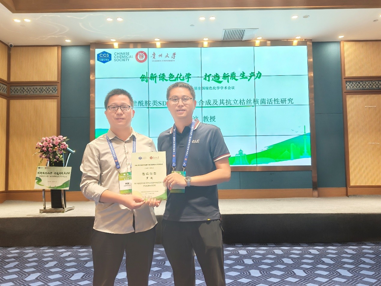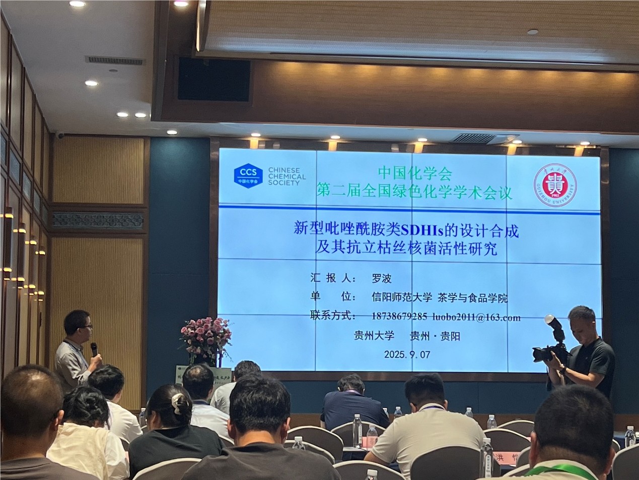 会议分为两个阶段:第一阶段为大会开幕式,第二阶段将举行六个专题分会,分别涵盖“高效绿色催化剂设计与催化反应”、“绿色反应路线与绿色产品”、“绿色化工科学与技术”、“绿色农药”、“绿色高分子材料化学”以及“育人育才研究生论坛”等议题。每个分会都将邀请相关领域的专家学者进行深入报告与交流。我院罗波博士应邀作了题为“新型吡唑酰胺类的设计合成及其抗立枯丝核菌活性研究”的学术报告,介绍了团队近3年来在新型绿色环保琥珀酸脱氢酶抑制剂的创制与应用方面所取得的系列成果。