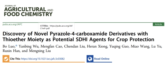 近日,我院罗波博士团队在国际知名的农林科学领域学术期刊《Journal of Agricultural and Food Chemistry》上发表了两篇学术论文。题目分别为《Discovery of novel pyrazole-4-carboxamide derivatives with thioether moiety as potential SDHI agents for crop protection》(DOI: 10.1021/acs.jafc.5c03082)和《Discovery of highly efficient novel potential SDHIs containing stilbenes group for management of sheath blight of rice and sclerotinia stem rot of oilseed rape》(DOI: 10.1021/acs.jafc.5c03978)。