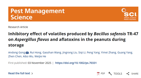 2025年11月8日,国际权威学术期刊《Pest Management Science》(该期刊属SCI收录、中科院农林科学一区TOP期刊)在线刊发了我院宫安东博士团队的研究论文,论文题为《Inhibitory effect of volatiles produced by Bacillus safensis TR‐47 on Aspergillus flavus and aflatoxins in the peanuts during storage》。